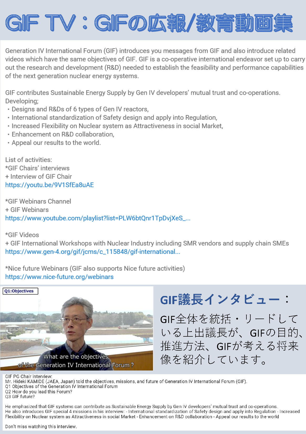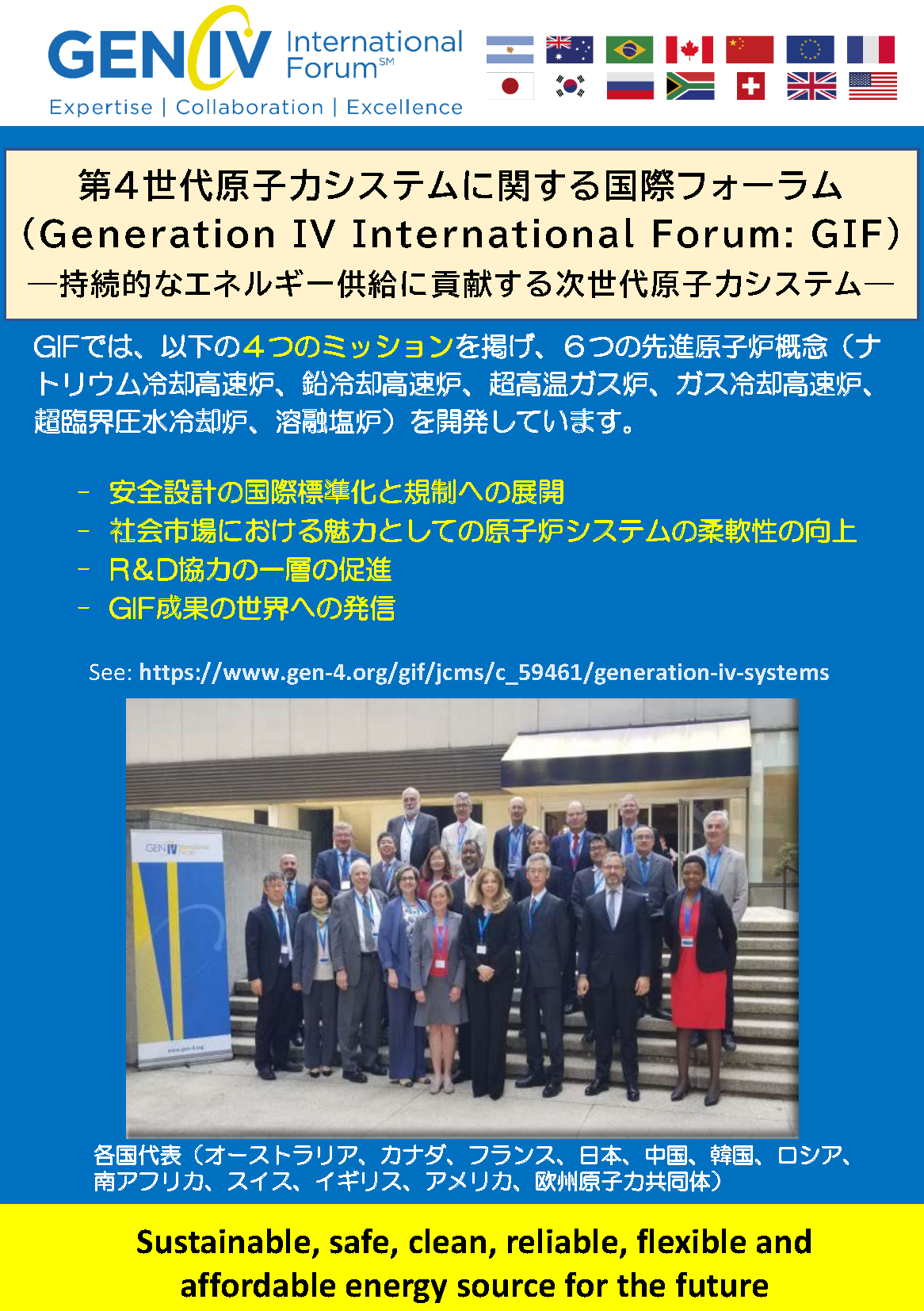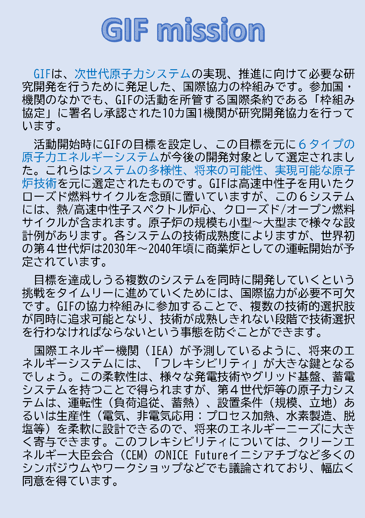 - GIFの目指す目標は、持続的なエネルギー供給に貢献する第4世代炉を実現する国際協力の促進です。第4世代炉は向こう千年に亘って持続的にエネルギーを安定して世界に供給できる、そんな技術です。