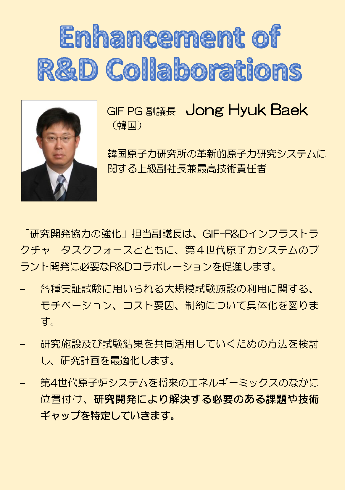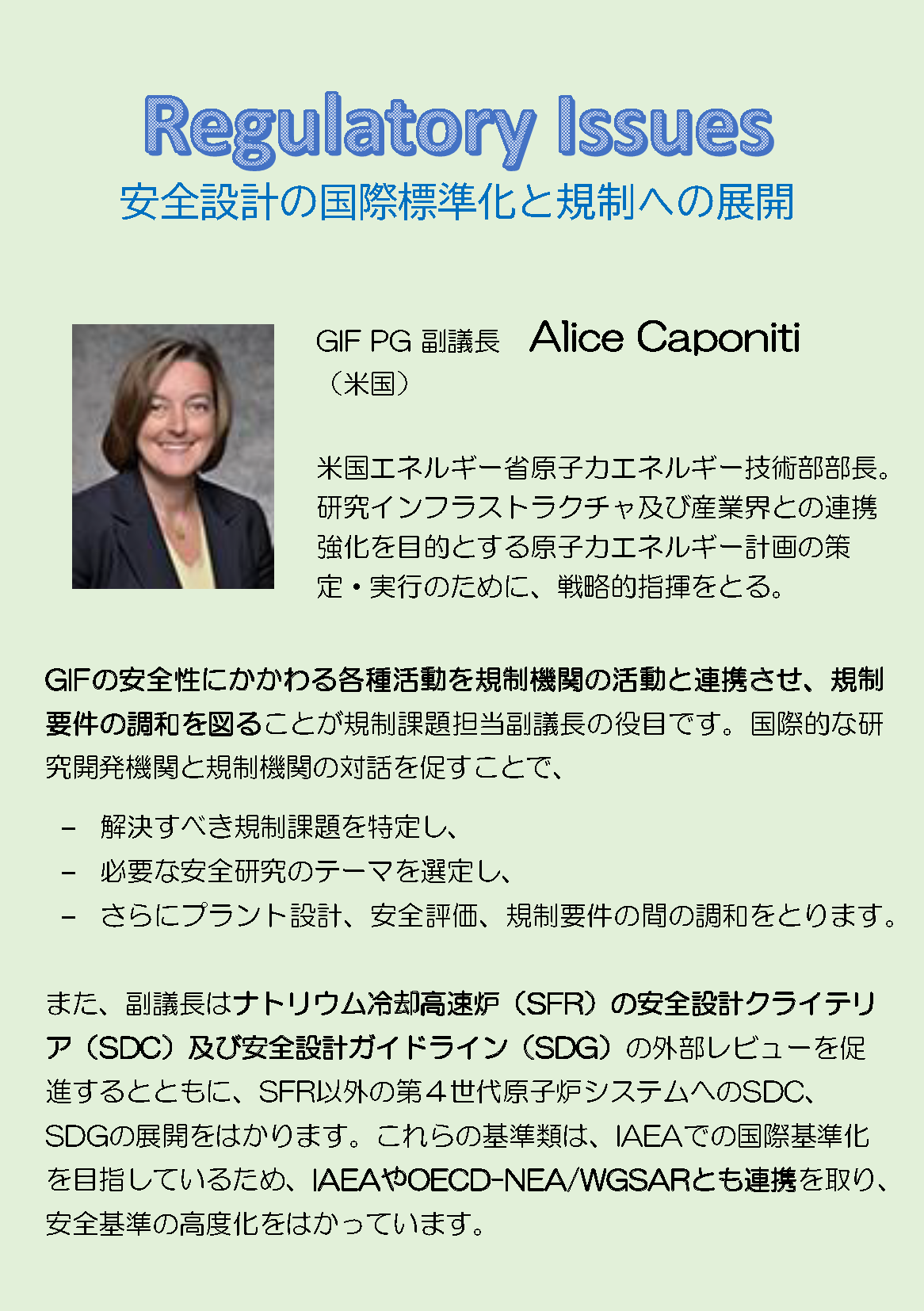- 原子力を取り巻く課題を解決するために、研究開発を促進し安全性を含む技術の世界標準を構築すること、政策レベルを含む様々なステークホルダーに第4世代炉の開発意義とその実力を示していくことが重用です。GIFが国レベルの国際組織であることの特徴を最大限生かして活動する中で、これらを実現できると考えています。