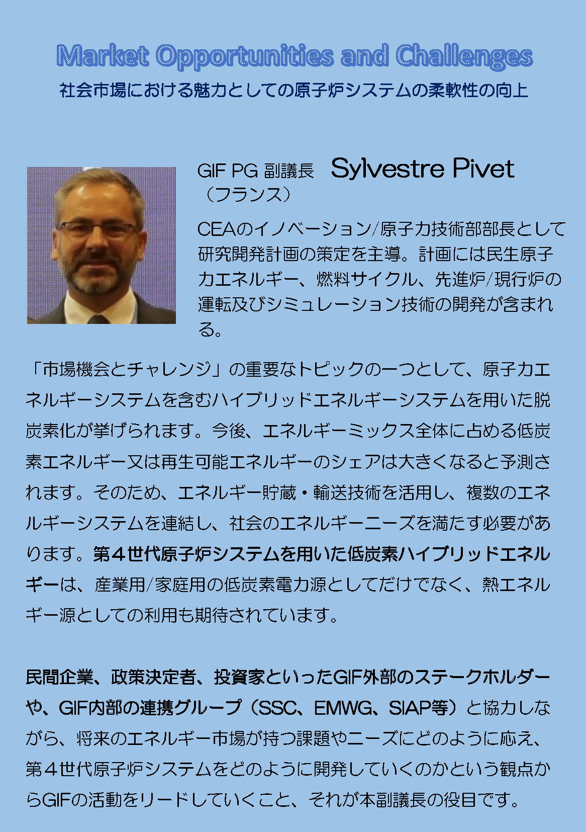 本記事は、2019年から2021年の3年間にわたり、第6代GIF議長を務めた上出英樹氏による寄稿です。上出氏は当時、本記事にて、GIFの目的や推進の方法、そして将来像についての紹介を行いました。文(動画)中には当時の副議長名なども登場しますが、第4世代炉を目指すGIFの理念や将来像は、現在も変わっていません。そこで本記事及び紹介動画にて、GIFのミッションとして改めてご紹介します。