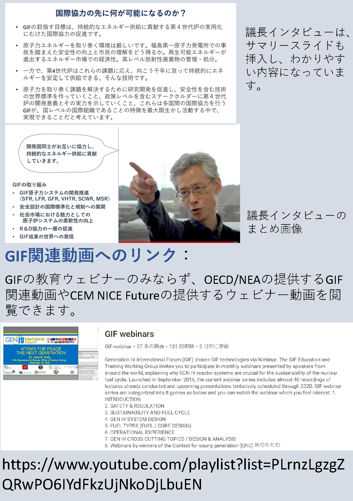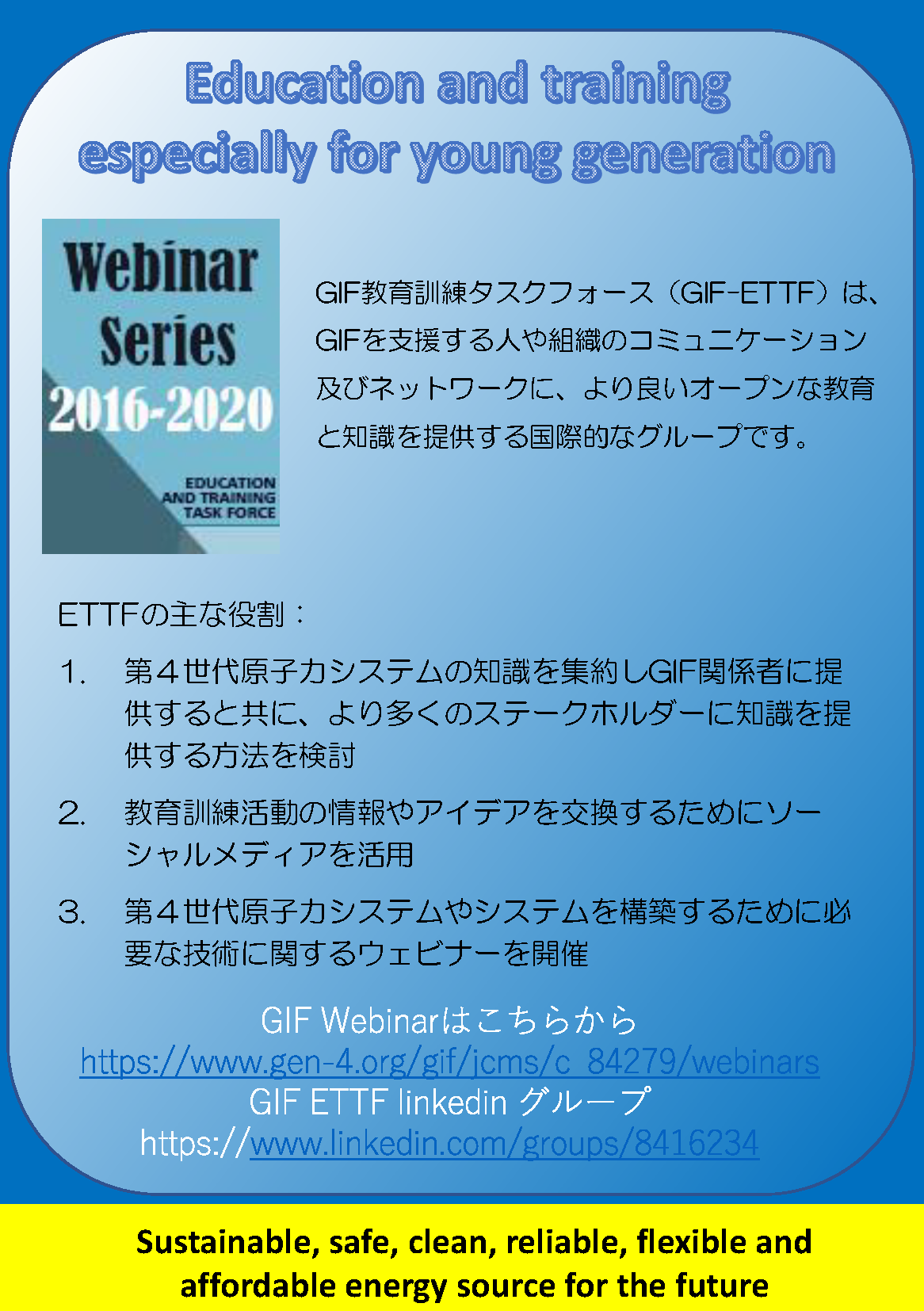 - 技術伝承としては、専門家が各炉システムの特徴、安全性等をinteractiveに講義するWebinarを実施しており、JAEAの専門家も以下のウェビナーに登壇しています。
